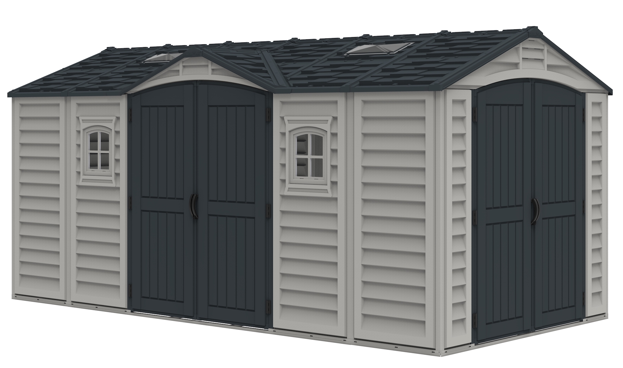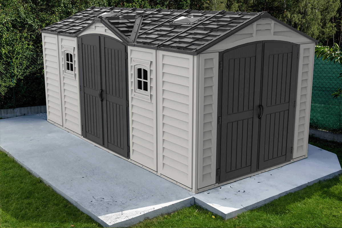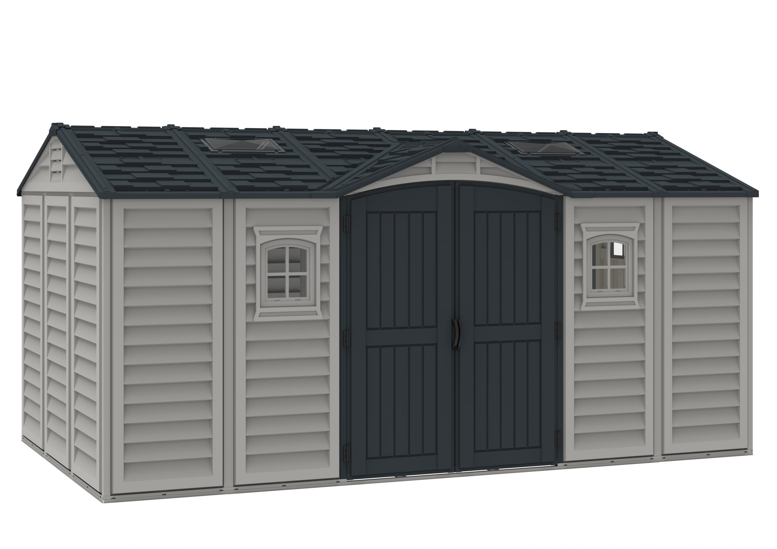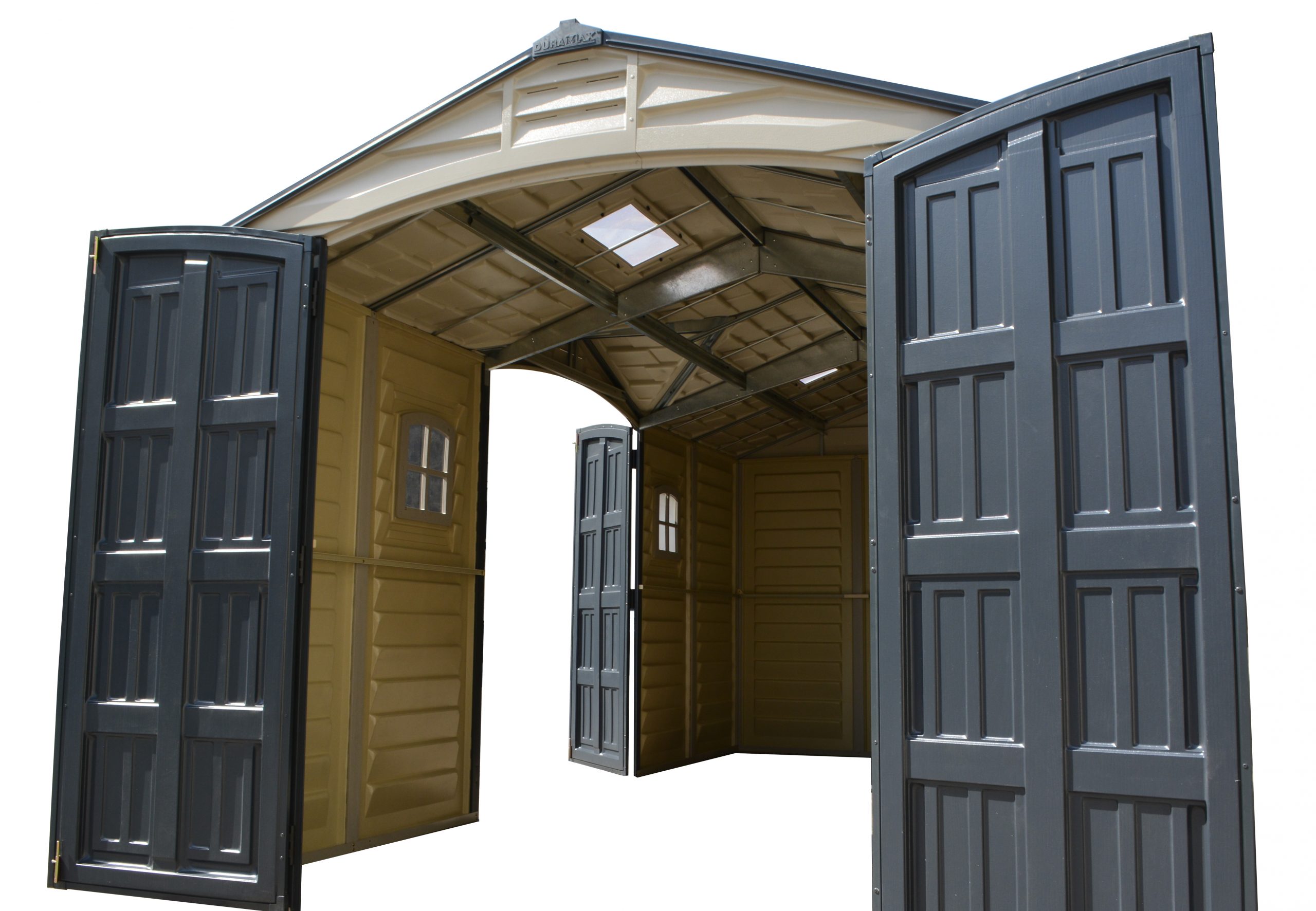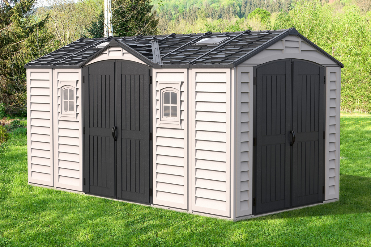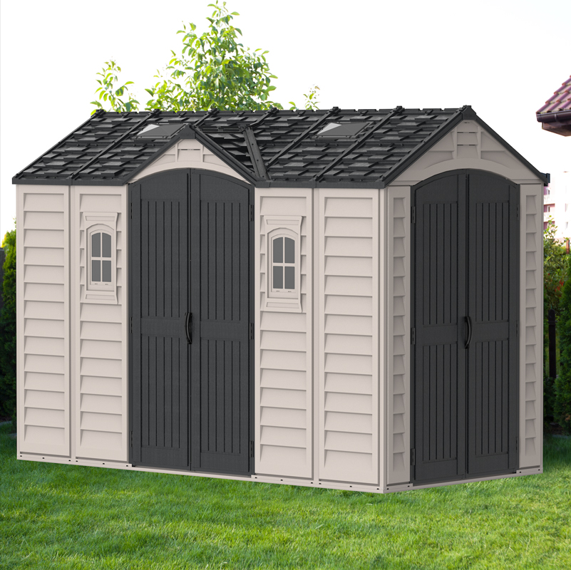 In choosing a large storage shed for storing, the most important things to look for are strength, durability and low maintenancE.The Apex Pro is the latest line of quality sheds produced under the Duramax brand. The brand Duramax to signify DURability and MAXimum quality and value. The Apex Pro has large double entry and double side doors.This provides storage accessibility from either side of the shed, insuring maximum utilization of storage and is easier to acquire the stored equipment. The Apex Pro was attractively designed to add beauty and blend into any yard area. The Apex Pro is maintenance free. It never needs painting and won't rust, rot or dent and is impervious to wood eating insects. This shed has two creatively designed skylights on the roof and two front windows for light control and has four slotted vents for air flow.The Apex Pro has more of the physical characteristics of a house than a shed. The fire retardant vinyl resin panels are supported by Heavy Duty interior galvanized steel columns, beams and trusses for strength and roof snow load. Vinyl unlike polyethylene is fire retardant and safe to store all your flammable items. The 15 years warranty supports our guarantee of quality and longevity. It has a step by step instruction manual to simplify assembly. We suggest two people to facilitate assembly.