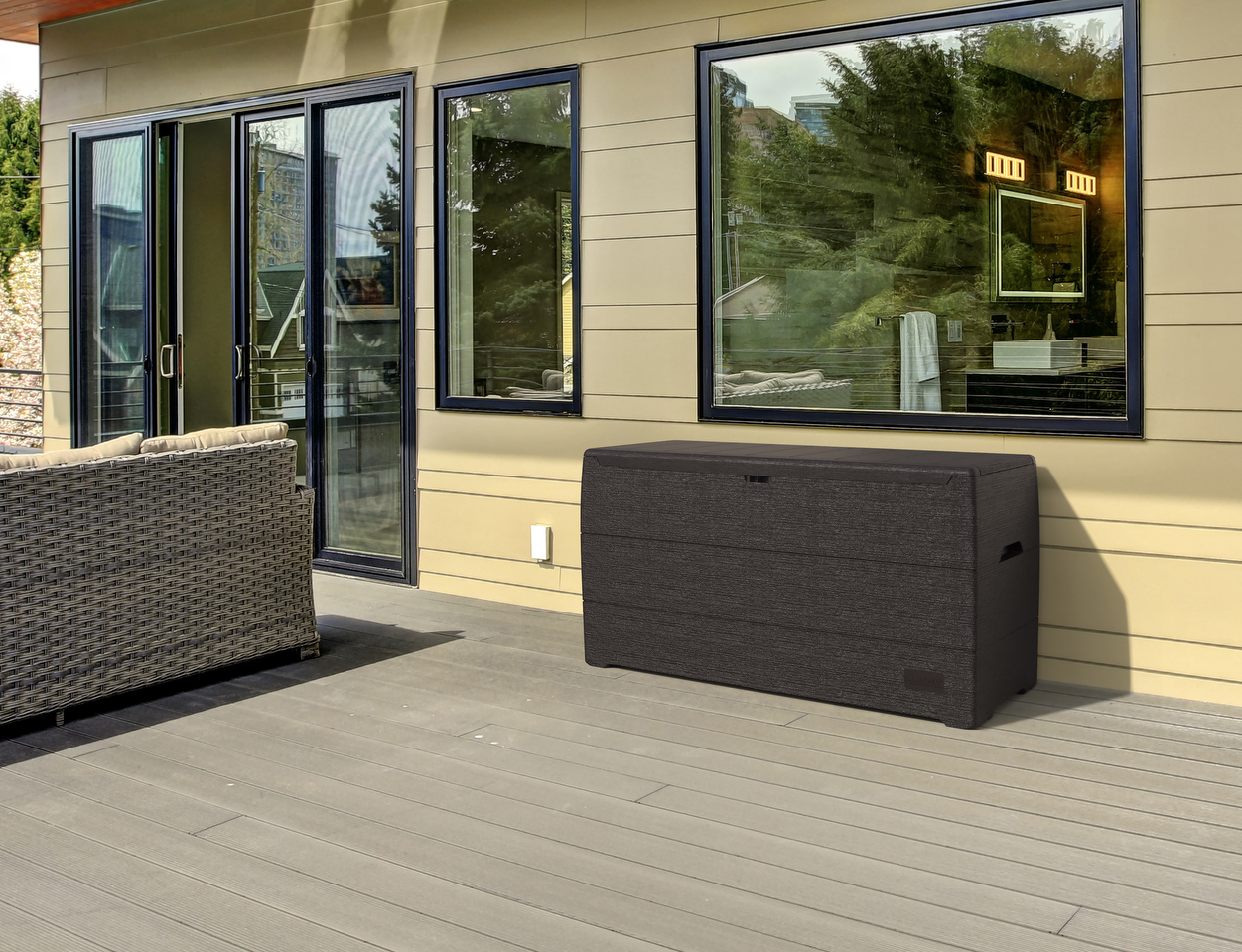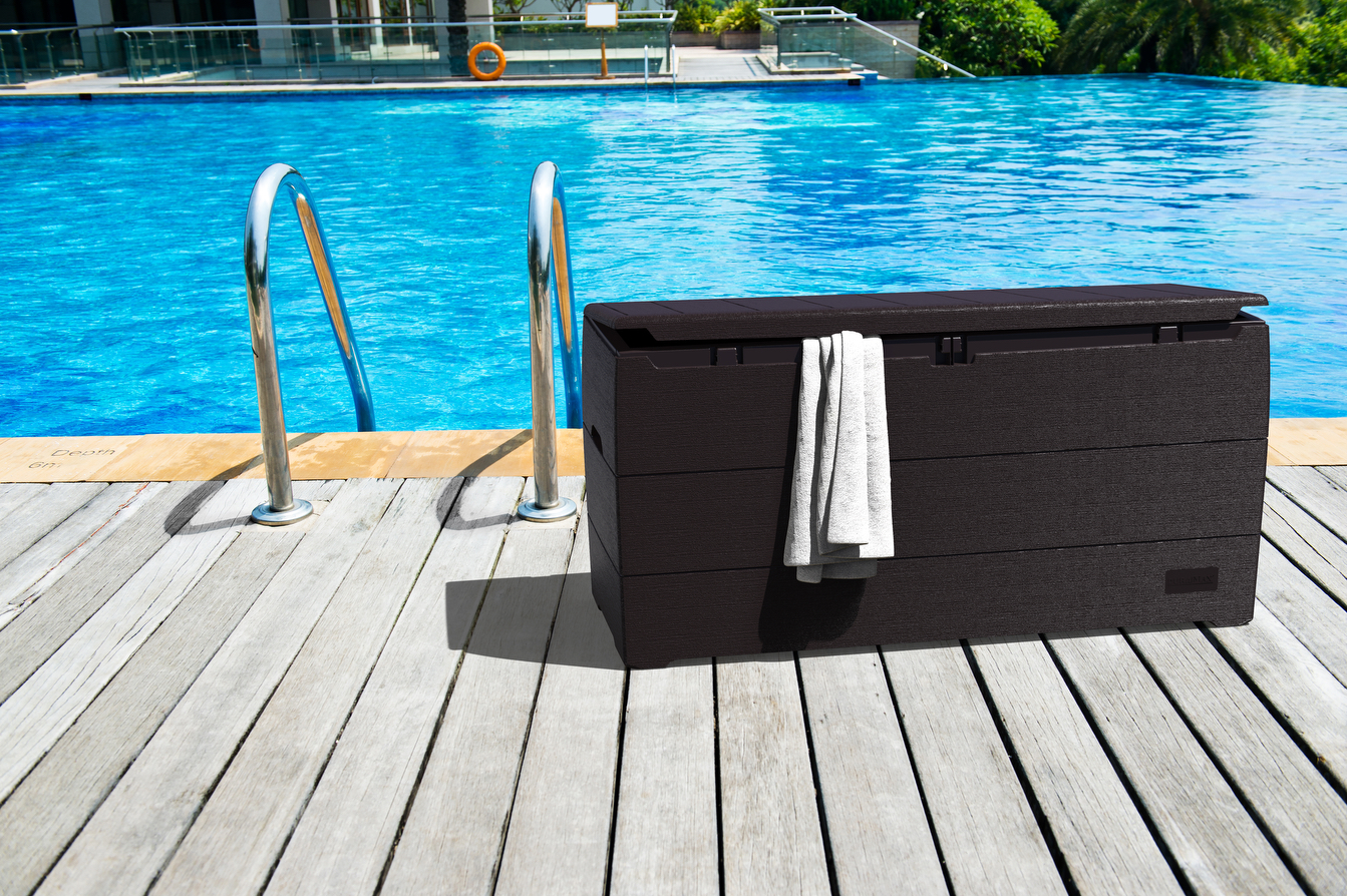 The DuraBox is a spacious 270 Liter outdoor storage container to hold all those cushions and patio items. It's made from the finest plastic resin and strong enough to sit on. The DuraBox won't dent, rot, rust, mildew or ever need painting and is impervious to wood eating insects. It will enchance the look of any patio or deck. The DuraBox sets the standard for deck boxes. This attractively designed, strong and spacious deck box will protect all those cushions and patio items from the elements. It comes with easy to assemble step by step instructions.The Durabox uniquely designed and spacious 270 L deck box is made from the finest fire-retardant plastic resin. It's 45" W x 17.7" D x 22" H size will accommodate those cushions and outdoor items that need protection from the elements. The DuraBox is not only strong and spacious but it's aesthetically pleasing design and color will enhance the appearance of any outdoor scene. This attractive looking deck box is strong enough to sit on. It comes with easy to assemble step by step instructions. The DuraBox won't rot, rust, dent, mildew or ever need painting and is impervious to wood-eating insects. When you are looking for a deck box that sets the standard for appearance, durability and value go no further than the DuraBox 270 L deck box