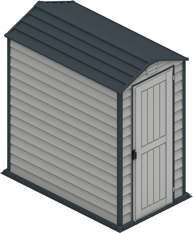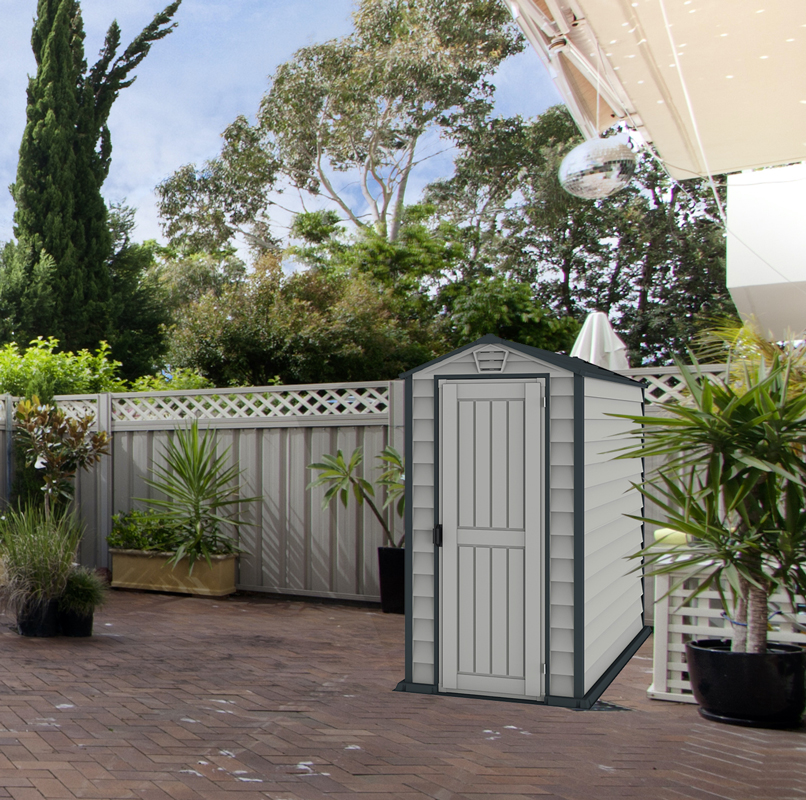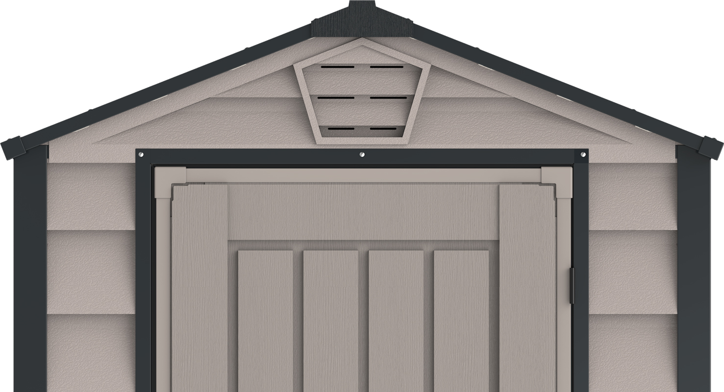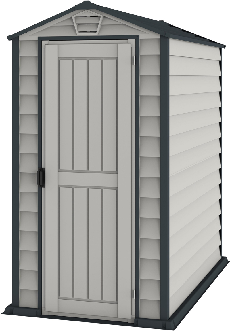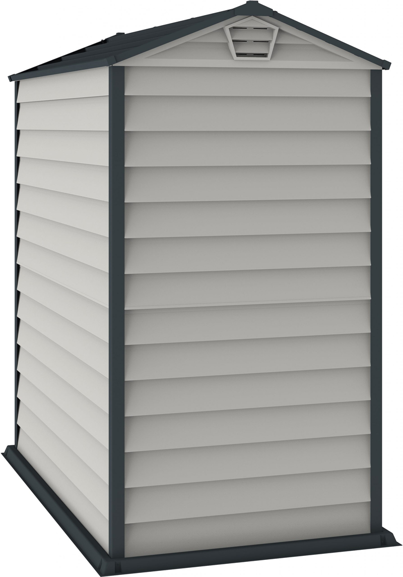 The EverMore 4 x 6 ft vinyl resin storage shed can accommodate those with smaller storage needs. This garden shed is ideal for use in smaller settings such as apartments, patios, and decks. The two-tone adobe and grey is sure to improve the look of any setting. Simulated grey shingle roof adds style to the shed’s look. It features a complete solid reinforced vinyl floor that eliminates the need for building a foundation. The Duramax EverMore shed is an all-weather durable vinyl storage shed that will not rust, rot, dent, or mildew and is fire retardant. The steel-reinforced structure inside the shed provides strength and durability. Assembly can be accomplished in just a few hours using common household tools. Organize your backyard garden tools, lawn chemicals, pool equipment, and much more with the EverMore 4 x 6 ft vinyl storage shed.